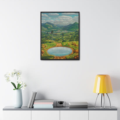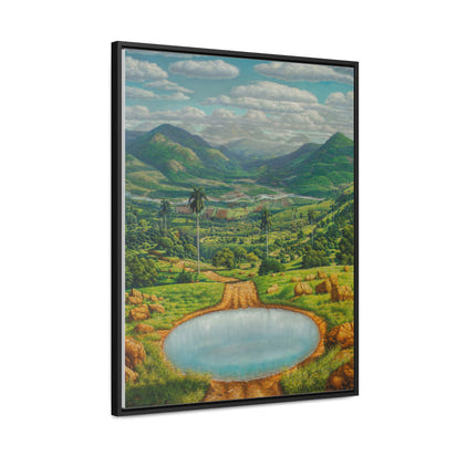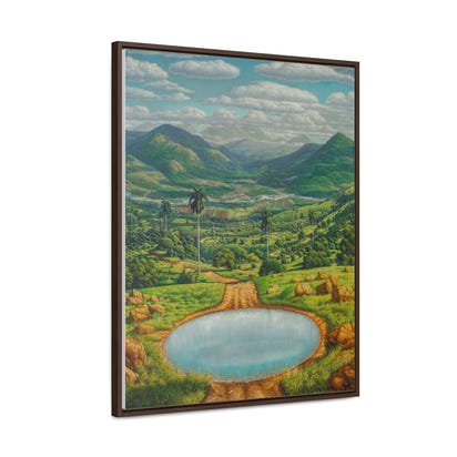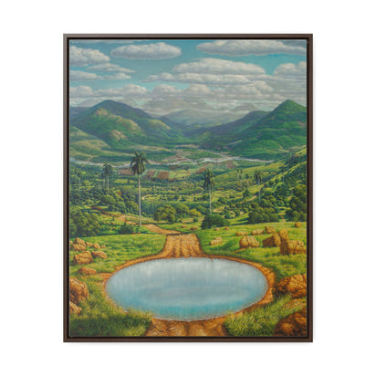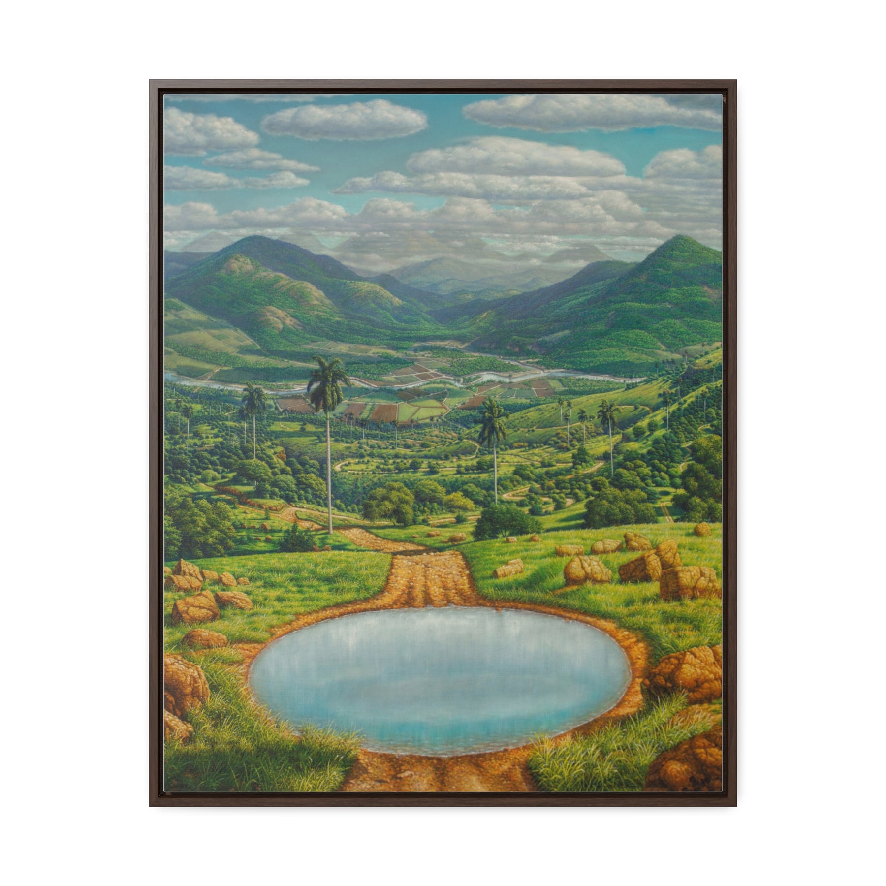 "Antes Lavate" immerses the viewer in a sublime and meticulously detailed landscape, evoking the exuberance and geography of rural Cuba, possibly the Pinar del Río region or an inland valley. The composition is dominated by a vibrant, saturated color palette — deep greens, earthy browns, and a blue sky dotted with dramatic, white clouds.